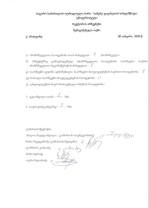 არჩევნებში ორი კანდიდატი მონაწილეობდა. ახალი რექტორი მოვალეობის შესრულებას 1–ელი თებერვლიდან შეუდგება. სამცხე-ჯავახეთის სახელმწიფო უნივერსიტეტის რექტორის არჩევნები დღეს, 30 იანვარს ჩატარდა.