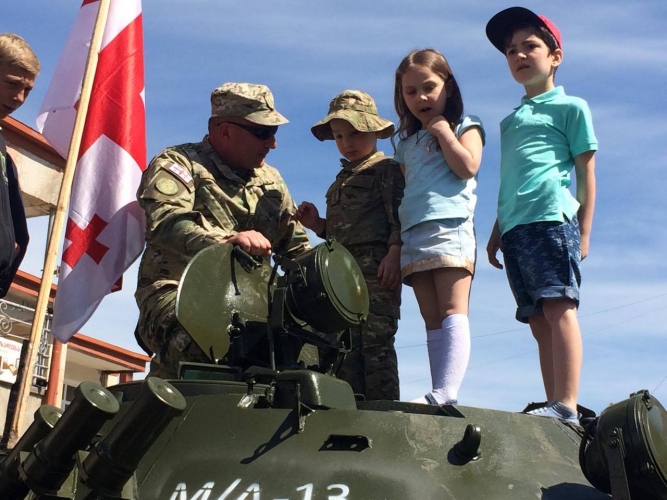 მოსახლეობას საშუალება აქვს აღჭურვილობა დაათვალიერონ და ტექნიკასთან ფოტოები გადაიღონ. ქართულ შეიარაღებას ათვალიერებენ ტურისტები.