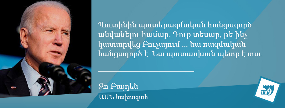 ԱՄՆ նախագահ Ջո Բայդենը Վլադիմիր Պուտինին հերթական անգամ անվանել է ռազմական հանցագործ և ասել, որ Բուչայում տեղի ունեցած սպանությունների պատճառով ՌԴ նախագահը պետք է պատասխանատվության ենթարկվի ռազմական հանցագործությունների համար։