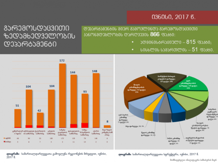 დეპარტამენტის მიერ საქართველოს მასშტაბით გამოვლენილია გარემოსდაცვითი კანონმდებლობის დარღვევის 866 ფაქტი. აქედან ადმინისტრაციულ სამართალდარღვევათა კოდექსის მიხედვით – 815 კანონდარღვევის ფაქტი დაფიქსირდა, ხოლო სისიხლის სამართლის კოდექსის მიხედვით – 51 ფაქტი.