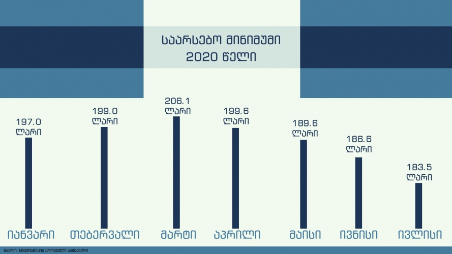 «Geostat»-ի համաձայն ՝ մինչև 2020-ի մարտը կենսամինիմումն աճում էր, իսկ ապրիլից սկսած նվազում է (չորս ամսվա ընթացքում 22,6 լարիով):