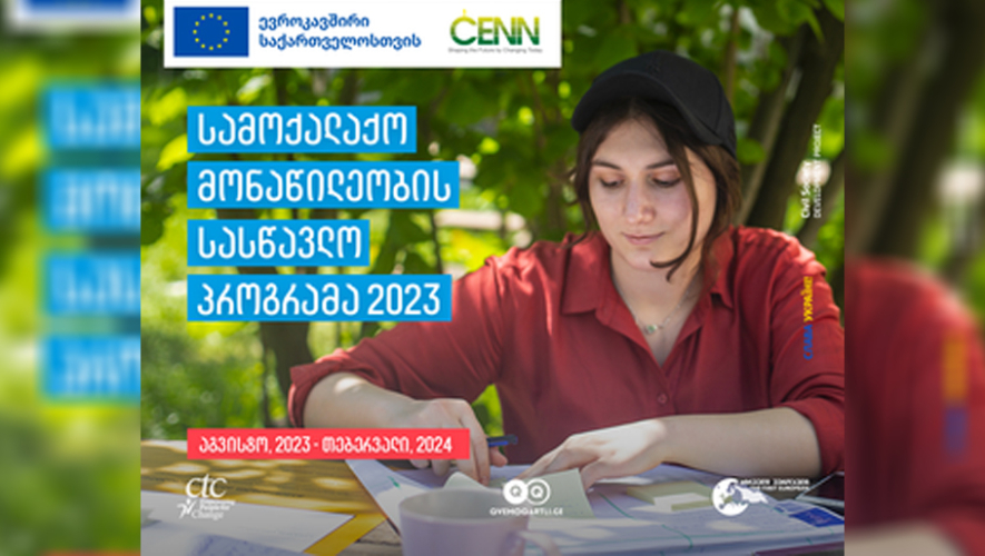 Եվրոմիության աջակցությամբ «Քաղաքացիական հասարակության հզորացում հանուն համապարփակ կանաչ վերականգնման հետկովիդից» ծրագրի շրջանակում CENN-ը հայտարարում է մրցույթ Քվեմո Քարթլիի և Սամցխե-Ջավախքի շրջաններից 18-30 տարեկան երիտասարդների համար՝ մասնակցելու քաղաքացիական մասնակցության 6-ամսյա վերապատրաստման ծրագրին։