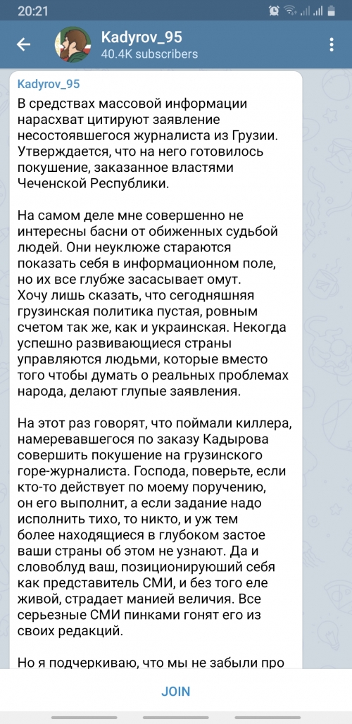 მივმართავ საქართველოს ხელისუფლებას, მიიღონ ზომები, რომელიც ხელს შეუწყობს ამ მოქალაქის ხელახალ აღზრდას. მას ვურჩევ სწორი დასკვნები გააკეთოს და გონს მოეგოს. წინააღმდეგ შემთხვევაში, ჩემს მტრად დარჩება," - ნათქვამია კადიროვის მიერ ტელეგრამზე გავრცელებულ განცხადებაში.