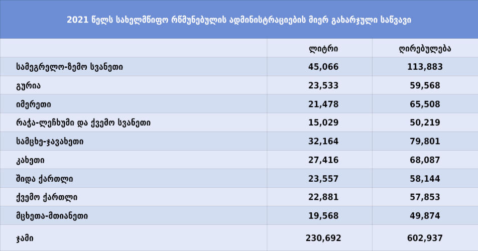 2021 წელს სახელმწიფო რწმუნებულების ადმინისტრაციებმა 230,692 ლიტრი საწვავი გახარჯეს, რომლის 32 პროცენტი - 74,482 ლიტრი უშუალოდ სახელმწიფო რწმუნებულებზე მოდის;