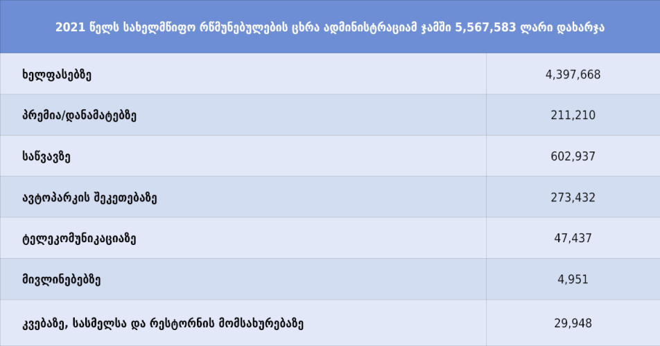 2021 წელს სახელმწიფო რწმუნებულის ადმინისტრაციებში შრომის ანაზღაურების სახით ჯამში 4,397,668 ლარი გაიცა;