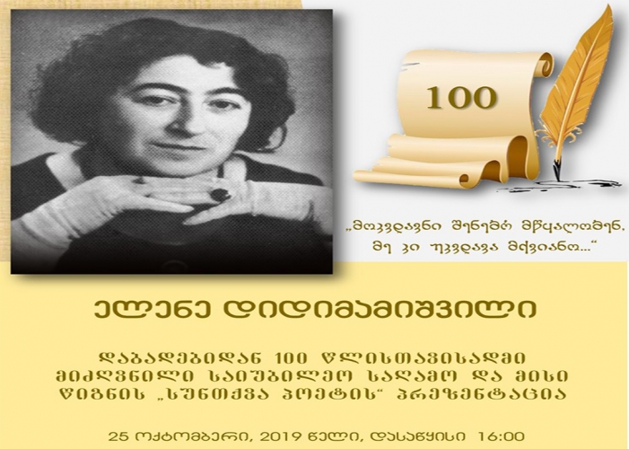 პარასკევს, 25 ოქტომბერს, 16:00 საათზე მესხეთის სახელმწიფო თეატრის მცირე დარბაზში, ელენე დიდიმამიშვილის დაბადებიდან 100 წლისთავისადმი მიძღვნილი საიუბილეო საღამო გაიმართება. ჩატარდება წიგნის „სუნთქვა პოეტის“ პრეზენტაციაზე.