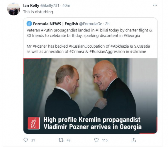 ამერიკის შეერთებული შტატების ყოფილი ელჩი საქართველოში, ვლადიმერ პოზნერისა და მისი მეგობრების საქართველოში ვიზიტს Twitter-ზე ეხმაურება. "შემაშფოთებელია" - წერს კელი.