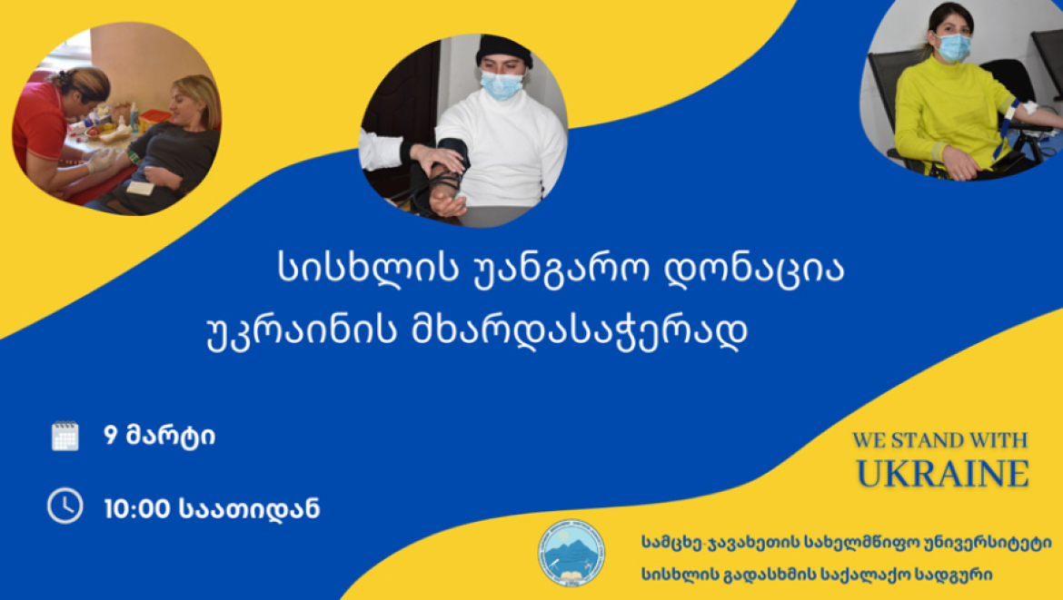 სამცხე-ჯავახეთის სახელმწიფო უნივერსიტეტი "სისხლის გადასხმის საქალაქო სადგურთან" თანამშრომლობით უკრაინის მხარდასაჭერად იწყებს დონაციის აქციას.