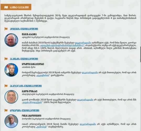 „საერთაშორისო გამჭვირვალობა-საქართველომ”, თბილისის მიღმა, საქართველოს ყველა მუნიციპალიტეტის მერების, საკრებულოს თავმჯდომარეებისა და მათი მოადგილეების 300-ზე მეტი ქონებრივი დეკლარაცია შეისწავლა, შედეგად, 78 დეკლარაციაში 128 სხვადასხვა დარღვევა გამოვლინდა. მათ შორის: