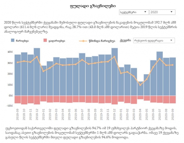კოვიდ19-ის პანდემიის გამო, საქართველოში, უცხოეთიდან გზავნილების რაოდენობა წინა წლებთან შედარებით შემცირდა. შემცირებული თანხების მიუხედავად, თანხის სიმრავლით მაინც რუსეთი ლიდერობს. ეროვნული ბანკის მონაცემების მიხედვით, 2019 წლის სექტემბერში, მეზობელი ქვეყნიდან საქართველოში თუ 29.8 მლნ აშშ დოლარი გადმოირიცხა, 2020 წლის სექტემბერში ამ თანხამ 35.1 მლნ აშშ დოლარი შეადგინა.