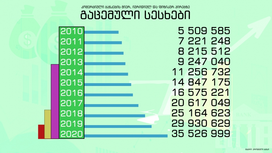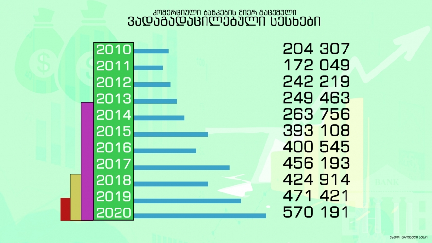 საქართველოს მოქალაქეებმა 2020 წელს, გასულ წელთან შედარებით, 5 მილიონი ლარით მეტი სესხი აიღეს. ეროვნული ბანკის ინფორმაციით, პირველი ნოემბრის მონაცემებით, კომერციული ბანკების მიერ, იურიდიულ და ფიზიკურ პირებზე, ქვეყანაში 35 526 999 ლარის სესხია გაცემული. ბოლო ათ წელში, მოქალაქეების სასესხო ვალდებულება, 30 მილიონი ლარით გაიზარდა.