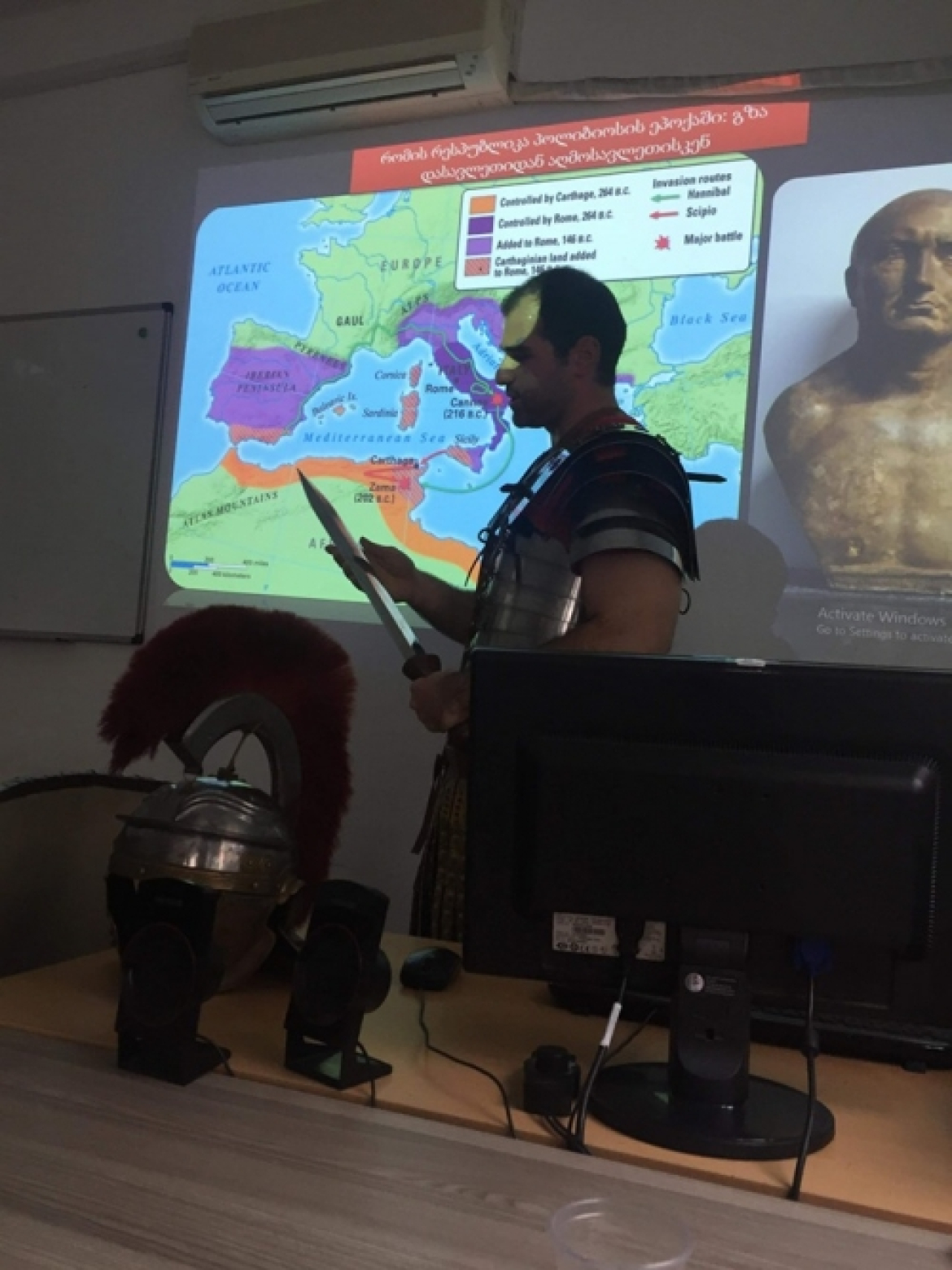 “გვქონდა I-II საუკუნეების რომაული აღჭურვილობის მთავარი ნაწილები (ნატურალური ზომა-წომის), მრავალფეროვანი სლაიდები და სცენები რომაელებზე გადაღებული რამდენიმე ფილმიდან (HBO Rome, Ben-Hur, Centurion), რომელთა ჩასმაც გარკვეული საკითხების უკეთესი აღქმისთვის მივიჩნიე საჭიროდ. ცოტა რომაული სამაგიდო თამაში Latrunculi-ც ვითამაშეთ ბოლოს”, – ამბობს GIPA-ს ლექტორი.