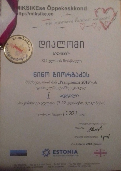 "სკოლის მოსწავლეებს შორის სამი ასაკობრივი კატეგორიაა. 1–3 კლასი, 4–6 კლასი, 7–12 კლასი, ცალ–ცალკე გოგონები და ბიჭები. სამი ეტაპი ონლაინ ვმონაწილეობდით. „პრანგლიმინე 2018“–ის ფინალი ქუთაისში გაიმართა. გამარჯვებულები უკრაინაში, საერთაშორისო ფინალისთვის მივემგზავრებით", – ამბობს ნინო გიორგაძე.