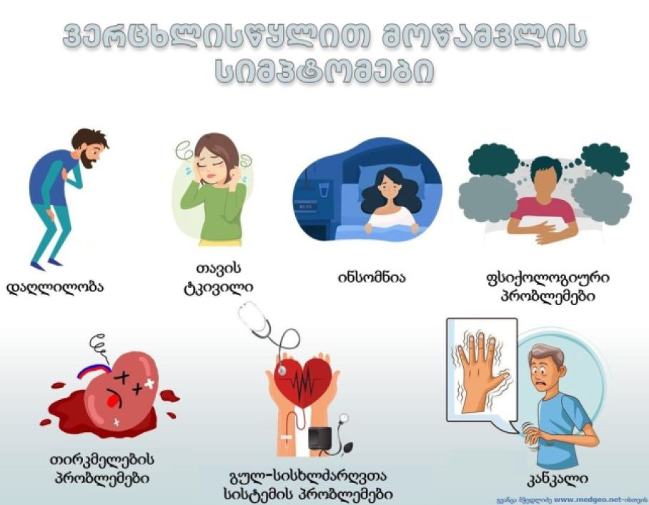 ხელების, ენის, ქუთუთოების, ფეხებისა და მთელი სხეულის კანკალით, არასტაბილური პულსით, გულის ფრიალით, მოუსვენრობითა და ფსიქიკური დარღვევებით.