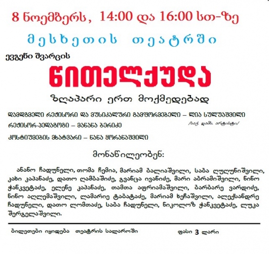 8 ნოემბერს, 14:00 და 16:00- სთ- ზე, მესხეთის დრამატულ თეატრში ევგენი შვარციის "წითელქუდას" პრემიერა გაიმართება.