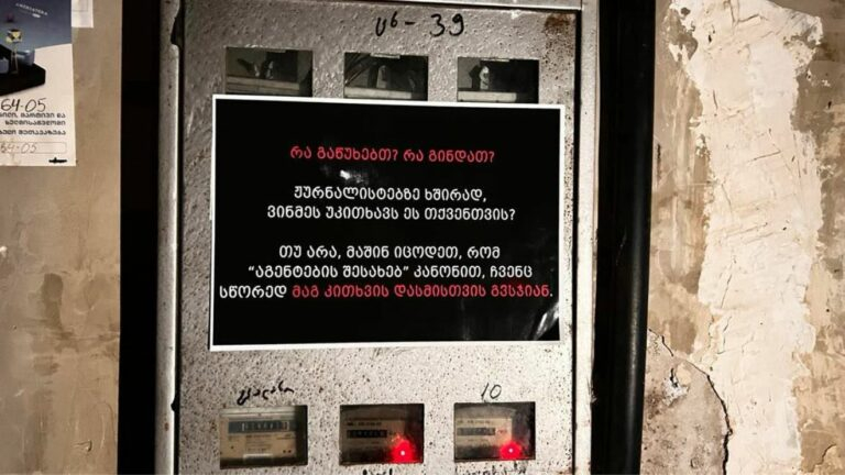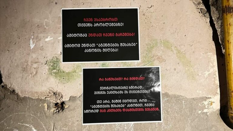 “ხელისუფლებას მხოლოდ წინასაარჩევნოდ ახსენდებით! თავისუფალ მედიას კი სულ ახსოვხართ! იცოდეთ “აგენტების შესახებ” კანონით იმ ჟურნალისტების გაქრობა უნდათ, ვინც თქვენს პრობლემებზე საუბრობს!”, – წერია ერთ-ერთ პლაკატზე.