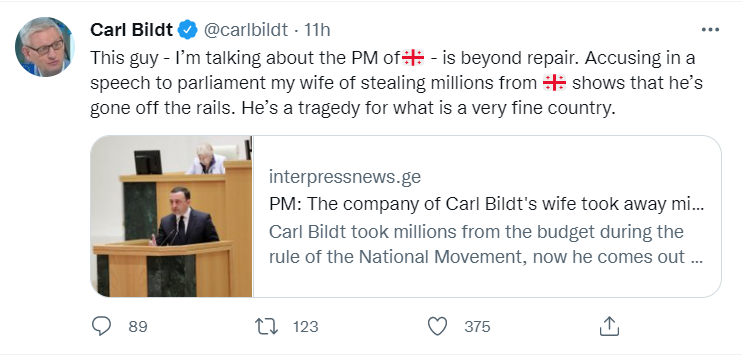 „ეს ბიჭი - მე ვსაუბრობ საქართველოს პრემიერ-მინისტრზე - რეაბილიტაციას აღარ ექვემდებარება. პარლამენტში გამოსვლისას ჩემი ცოლის დადანაშაულება საქართველოდან მილიონების ქურდობაში აჩვენებს, რომ ის რელსებიდან გავიდა. ის ტრაგედიაა ძალიან კარგი ქვეყნისთვის”,- წერს ბილდტი.