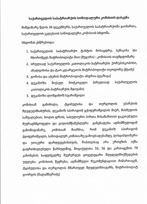 განცხადებას საპატრიარქო თან ურთავს საქართველოს საპატრიარქოს სინოდალური კომისიის დასკვნასაც, რომლის თანახმადაც, სხდომა მიმდინარე წლის 26 დეკემბერს გაიმართა.