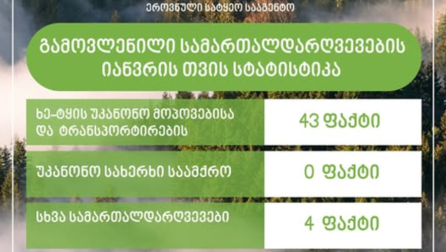 ეროვნული სატყეო სააგენტოს ინფორმაციით, მიმდინარე წლის იანვრის თვეში, სამართალდარღვევის 47 ფაქტი გამოავლინეს.