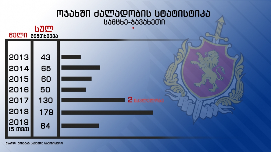 ოჯახში ძასლადობის შემთხვევების გამოვლინებამ იმატა. შინაგან საქმეთა სამინისტროს ოფიციალური ინფორმაციით, 2019 წლის ხუთი თვის მონაცემებით, საქართველოში 2 396 შემთხვევა დაფიქსირდა, ამ პერიოდში მოკლეს რვა ქალი. 2019 წლის 14 ივნისის მდგომარეობით, პოლიციის მიერ, საქართველოში გაცემულია 4 426 შემაკავებელი ორდერი.