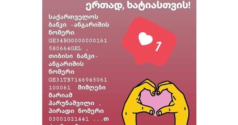ხატია პარუნაშვილს მკურნალობისთვის 72 ათასი დოლარი სჭირდება, რის საშუალებაც ოჯახს არ აქვს. ამის გამო, გაიხსნა ანგარიში: