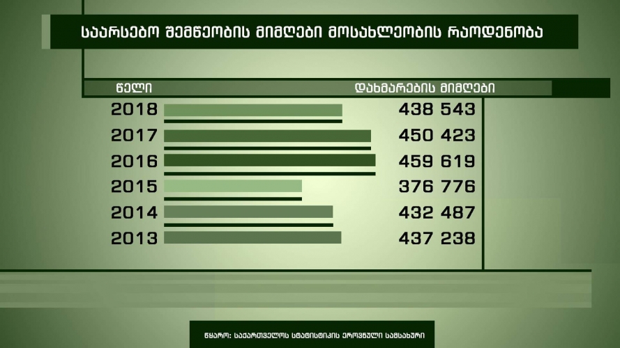 საქართველოს სტატისტიკის ეროვნულმა სამსახურმა, საარსებო შემწეობის მიმღები მოსახლეობა დაითვალა. სოციალური მომსახურების სააგენტოდან მიღებული ოფიციალური მონაცემების მიხედვით, 2018 წელს სახელმწიფოსგან დახმარებას 438 543 პირი იღებდა, რაც ქვეყნის მოსახლეობის დაახლოებით, 12% შეადგენს.