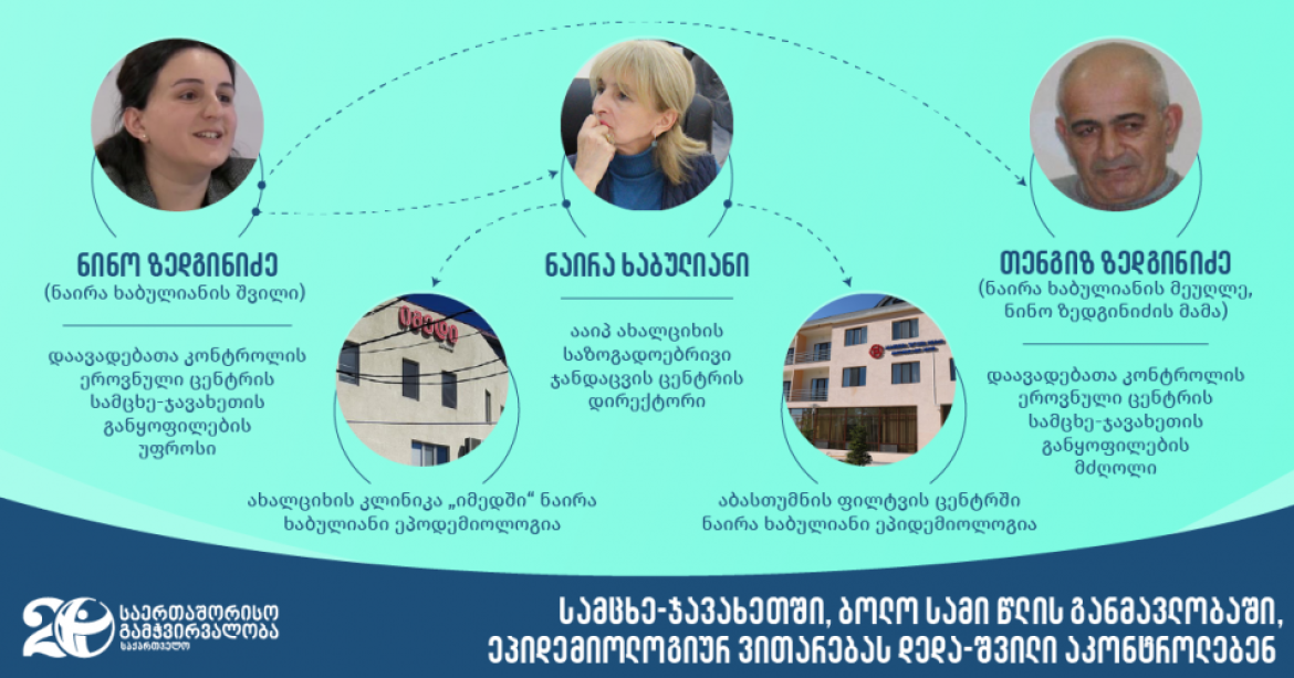 ახალციხის მუნიციპალიტეტის ააიპ “საზოგადოებრივი ჯანდაცვის ცენტრის” დირექტორი ნაირა ხაბულიანი რამდენიმე ანაზღაურებად საქმიანობას ითავსებს. მათ შორის ერთ-ერთი ახალციხის კლინიკა "იმედში“ ეპიდემიოლოგის პოზიციაა. იგი, როგორც ააიპ-ის ხელმძღვანელი, ეპიდზედამხედეველობას საკუთარ თავსაც უწევს. გარდა ამისა, კორონავირუსის დროს სამცხე-ჯავახეთში შექმნილ ცხელების ორივე ცენტრში ხაბულიანი ეპიდემიოლოგად ერთდროულად მუშაობდა, რასაც კანონი კრძალავდა. სამსახურს კი, რომელიც ეპიდზედამხედველობას მთელ რეგიონში ახორციელებს, ნაირა ხაბულიანის შვილი ხელმძღვანელობს - ნინო ზედგინიძე დაავადებათა კონტროლის ეროვნული ცენტრის სამცხე-ჯავახეთის განყოფილების უფროსია. ინფორმაციას საზოგადოებრივი ორგანიზაცია "საერთაშორისო გამჭვირვალობა-საქართველო" ავრცელებს.