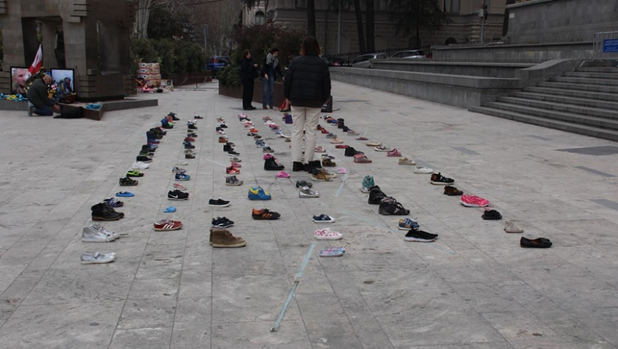 უკრაინაში დაღუპული ბავშვების ხსოვნის პატივსაცემად, საქართველოს პარლამენტთან 145 ფეხსაცმელი მიიტანეს