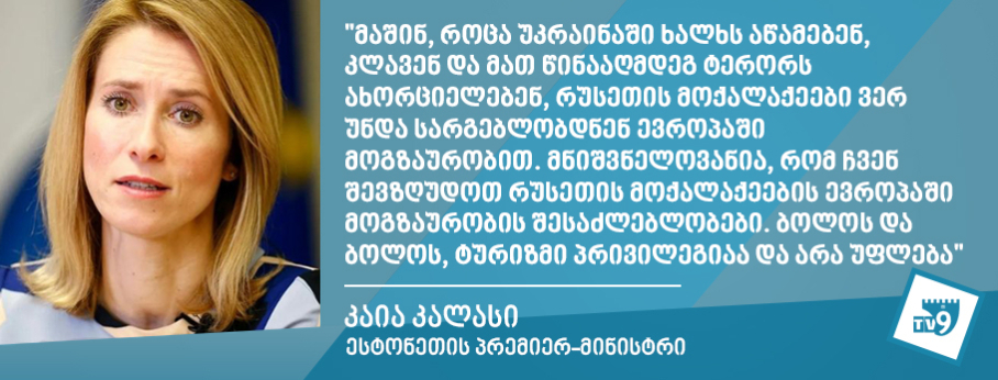 "მაშინ, როცა უკრაინაში ხალხს აწამებენ, კლავენ და მათ წინააღმდეგ ტერორს ახორციელებენ, რუსეთის მოქალაქეები ვერ უნდა სარგებლობდნენ ევროპაში მოგზაურობით. მნიშვნელოვანია, რომ ჩვენ შევზღუდოთ რუსეთის მოქალაქეების ევროპაში მოგზაურობის შესაძლებლობები. ბოლოს და ბოლოს, ტურიზმი პრივილეგიაა და არა უფლება", - ნათქვამია ესტონეთის პრემიერ-მინისტრის კაია კალასის მიერ გავრცელებულ განცხადებაში.