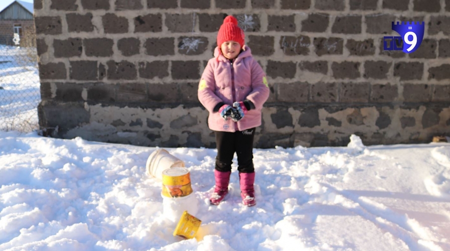 ვიდრე მოზარდები გზას წმენდენ, პატარები თოვლში თამაშობენ.