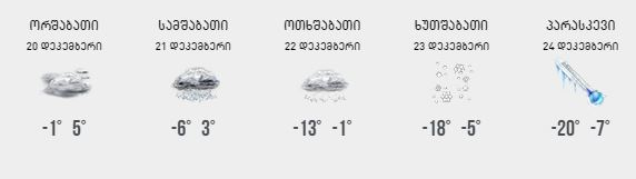 რაც შეეხება ახალციხეს, 23 და 24 დეკემბერს, მოსალოდნელია ძლიერი ყინვა. ტემპერატურა აქ მინუს 20 გრადუსამდე დაეცემა.