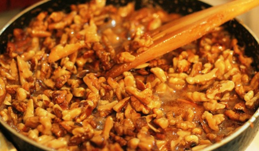 შემდეგ ვუმატებთ დათლილ ნიგოზს, კარგად მოვურევთ და დაბალ ცეცხლზე ვშუშავთ რამდენიმე წუთი, სანამ ნიგოზი ოქროსფერს არ მიიღებს. შემდეგ გაგმოვიღებთ დაფაზე, რომელსაც წინასწარ ცივი წყლით დავასველებთ. შემდეგ ნიგვზის მასას სველი საბრტყელებლით გადავანაწილებთ მთელ დაფაზე.
