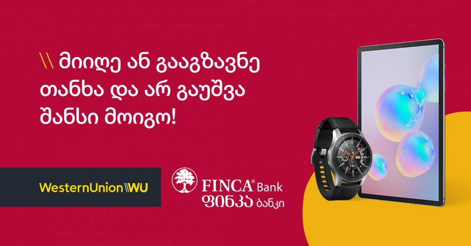 10 მაისიდან ფინკა ბანკში Western Union-ის ფულადი გზავნილების აქცია დაიწყო. მომხმარებლები, რომლებიც აქციის პერიოდში ყველაზე ხშირად ისარგებლებენ Western Union-ით საჩუქრად Samsung Galaxy Tab S6-ს, Samsung Galaxy Watch 46mm-ს და სხვა გარანტირებულ სამახსოვრო პრიზებს მიიღებენ.