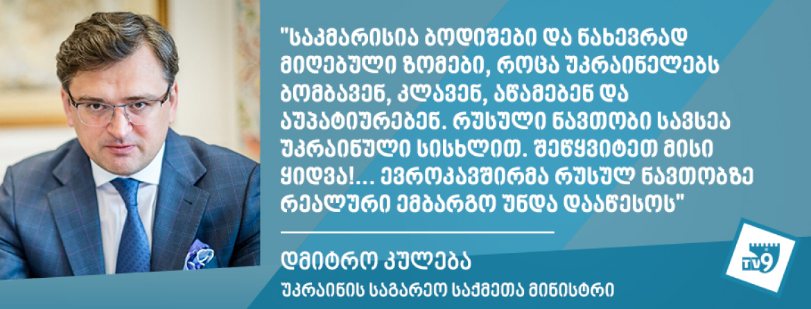 „საკმარისია ბოდიშები და ნახევრად მიღებული ზომები, როცა უკრაინელებს ბომბავენ, კლავენ, აწამებენ და აუპატიურებენ. რუსული ნავთობი სავსეა უკრაინული სისხლით. შეწყვიტეთ მისი ყიდვა!“- წერს კულება „ტვიტერზე“.