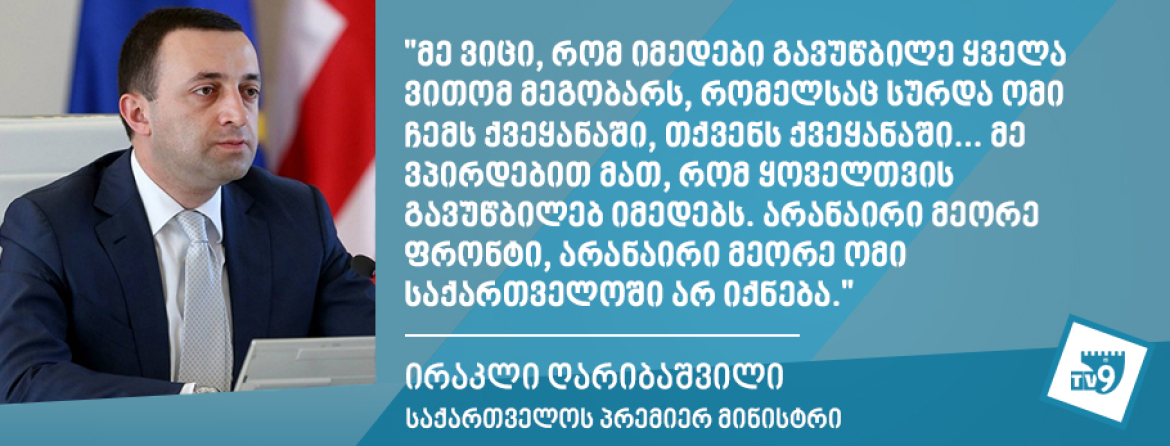 „მე ვიცი, რომ იმედები გავუწბილე ყველა ვითომ მეგობარს, რომელსაც სურდა ომი ჩემს ქვეყანაში, თქვენს ქვეყანაში და ჩვენი ხალხის მოკვლა, გაუბედურება და განადგურება ქვეყნის. მე ვპირდებით მათ, რომ ყოველთვის გავუწბილებ იმედებს. არანაირი მეორე ფრონტი, არანაირი მეორე ომი საქართველოში არ იქნება. ეს არის ჩვენი პრინციპული გადაწყვეტილება“ , - განაცხადა პრემიერმა.