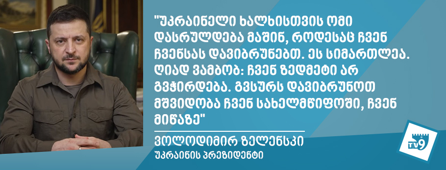 „რუსეთს თანმიმდევრობით მიჰქონდა ყველა ჩვენი უფლება: უფლება ჩვენ მიწაზე, არჩევანზე და საბოლოოდ მივედით სიცოცხლის უფლებამდეც. ჩვენ ახლა სიცოცხლისთვის ვიბრძვით სიცოცხლის დაკარგვით“ , - აღნიშნა ზელენსკიმ.