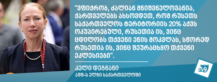 შეერთებული შტატები და ევროპა ვაკეთებთ ყველაფერს, რაც შეგვიძლია იმისთვის, რომ დავეხმაროთ საქართველოს ევროატლანტიკური ინტეგრაციის გზაზე და გავაგრძელებთ ამის გაკეთებას. ვფიქრობ, ძალიან მნიშვნელოვანია, ქართველებს ახსოვდეთ, რომ რუსეთს საქართველოს ტერიტორიის 20% აქვს ოკუპირებული, რუსეთია ის, ვინც ცდილობს თქვენი ენის მოკვლას, სწორედ რუსეთია ის, ვინც შეურაცხყო თქვენი ეკლესიები ცხოველების სადგომად მათი გამოყენებით, - ამის შესახებ საქართველოში აშშ-ის ელჩმა კელი დეგნანმა განაცხადა.