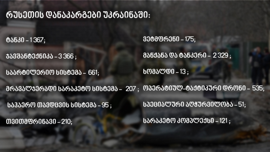 უკრაინის თავდაცვის სამინისტროს გენერალური შტაბის ინფორმაციით, რუსულმა ძალებმა 30 950 ჯარისკაცი დაკარგეს.