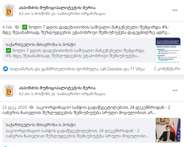 Եթե Ֆեյսբուքի էջի որոնման դաշտում մուտքագրեք COVID19 բառը, կտեսնեք գրառումներ՝ տարածված Վրաստանի կառավարության և վարչակազմի կայքերից, կորոնավիրուսի հետ կապված նորությունների վերաբերյալ: