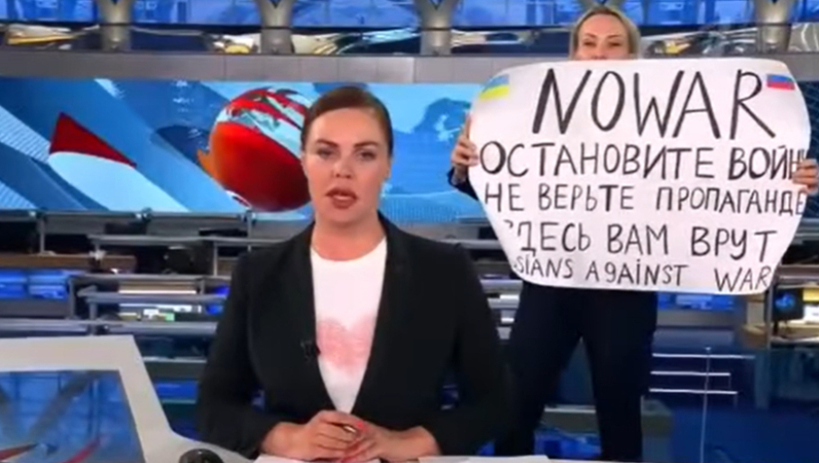 შეგახსენებთ, რუსეთის „პირველი არხის“ საინფორმაციო გადაცემა "ვრემიას" დროს, მარინა ოვსიანიკოვა პირდაპირ ეთერში წამყვანის უკანა ფონზე ომის საწინააღმდეგი ბანერით, "არა ომს, შეაჩერე ომი" შევიდა, რომელზეც ეწერა „არ დაუჯეროთ პროპაგანდას, აქ გატყუებენ, რუსები ომის წინააღმდეგ". მედიის ინფორმაციით, ის სახელმწიფო ტელევიზიაში რედაქტორად მუშაობდა.